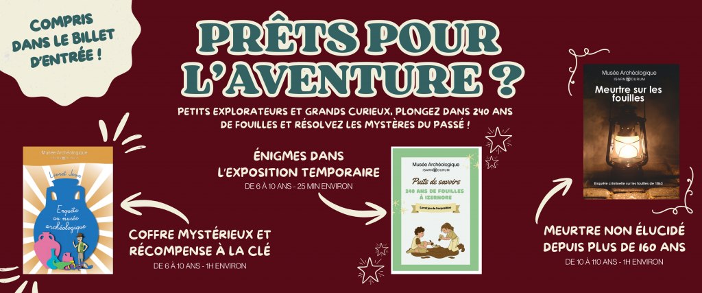Envie de (re)découvrir les collections et l’histoire du site archéologique autrement ? Envie de frissonner en enquêtant sur un meurtre datant de 1863 ? Envie de découvrir qui a assassiné Victor Corbet et pourquoi ? Demandez «le livret « Enquête au musée » lors de votre prochaine visite !